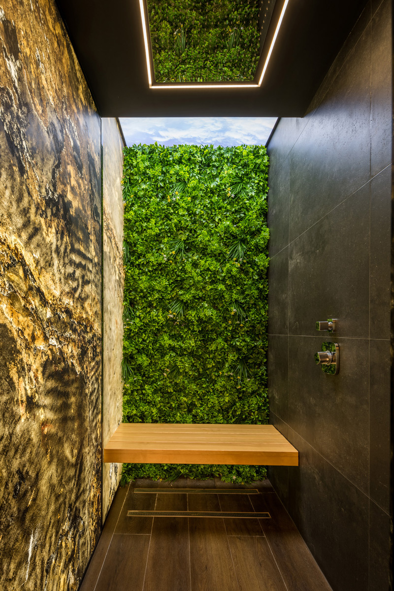 Hunyja be szemét, hagyja magát egy kis időre elvarázsolni a trópusi élményzuhanyunk által. A mennyezetről nagy felületen esőként lezúduló víz hőfoka és intenzitása egyénileg szabályozható, ezáltal egyedülálló élményt biztosít. A zuhanyzó fala átvilágított természetes palakőből készült, továbbá a hangrendszernek köszönhetően kellemes zene mellett élvezhetjük a zuhanyzás utáni frissítő pillanatokat a zuhanyzóban található pihenőpadon. A zuhany frissítő hatását legjobban a finn- vagy az infraszauna használata után élvezhetjük, de egy kiadós fitnesz edzés után is kellemes élményt nyújthat.
